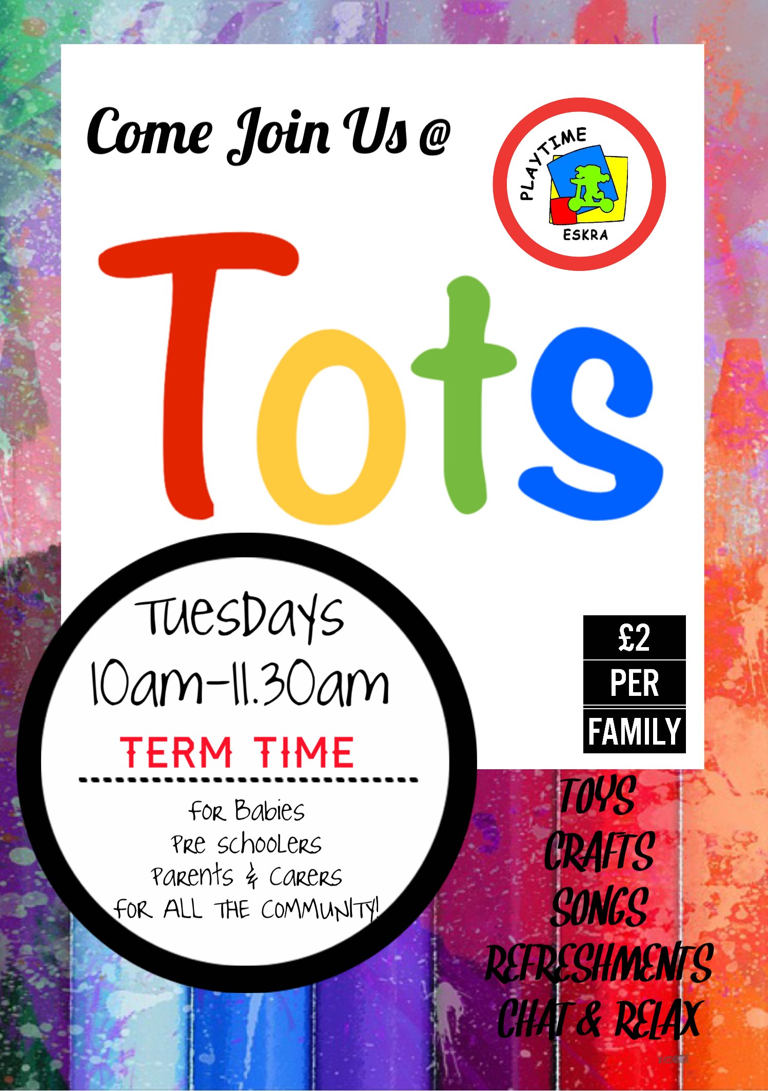 Playtime hosts a Toddler group, as we recognise the importance of having the opportunity to socialise and share experiences with other parent and carers. Tuesdays @10am (School Term time).